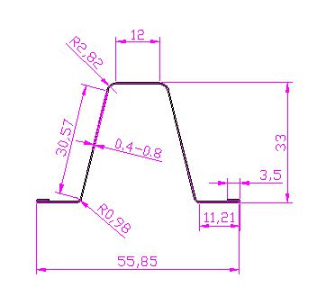 La máquina perfiladora de rollos de chapa colaborante YX33-56 está diseñada para producir perfiles de chapas colaborantes con un ancho de 56mm y una altura de pestaña de 33mm, con una velocidad máxima de producción de 30m/min.