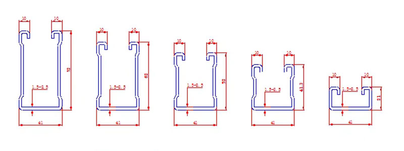 Tamaños disponibles para 41-21, 41-41, 41-52, 41-62, 41-72 cinco tipos de perfil que se forman con punzonado rotativo continuo.